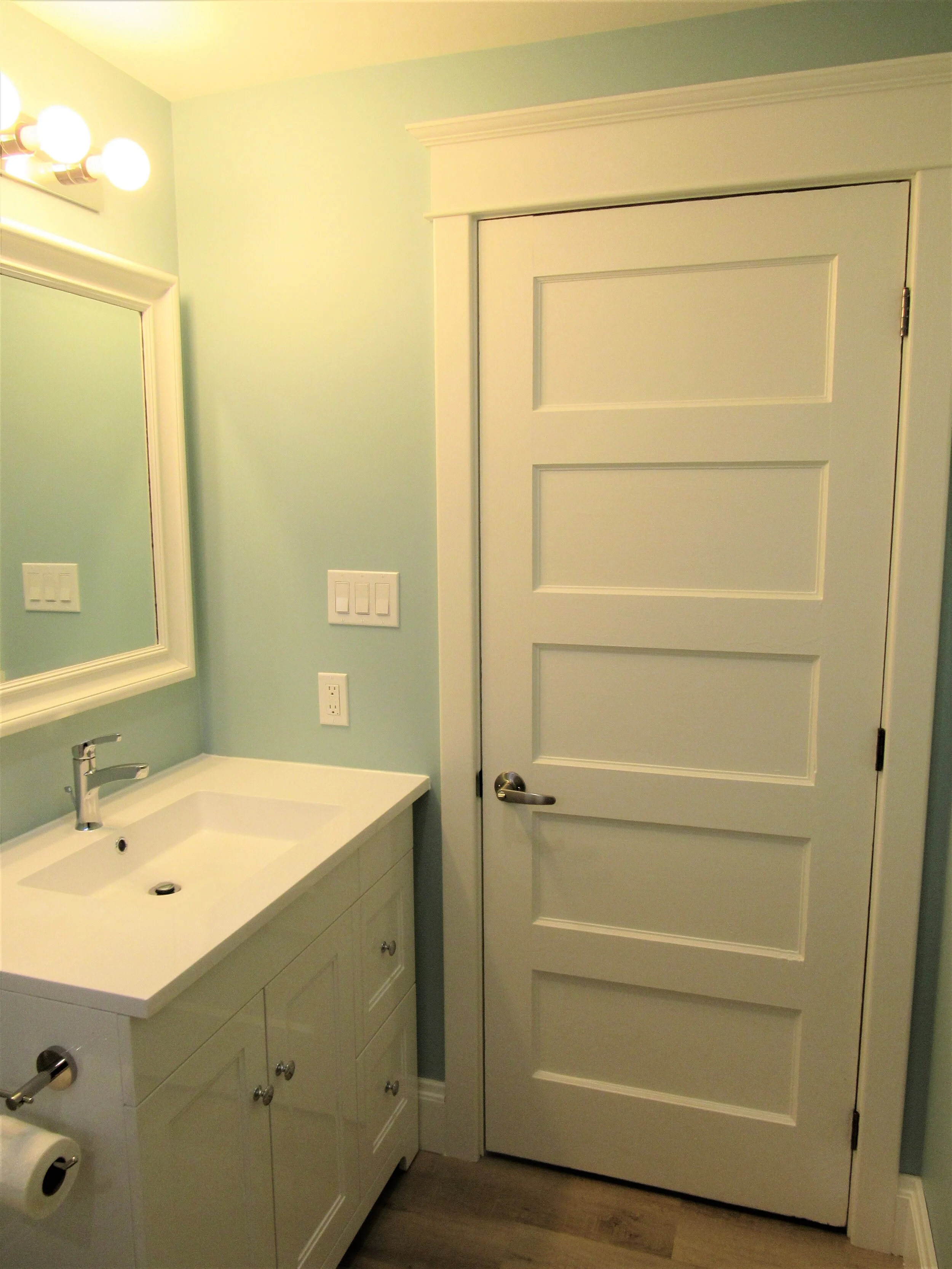 When we are renovating in older homes, we take the time to improve comfort and that often involves insulation. Once the wall was opened in this double-brick home in Welland, it was clear that it needed some help to ensure the new bathroom would be comfortable year round. This small space was revitalized with a new tub and tiled shower that will last for many years, and the original 5 panel solid wood door was repainted to continue its purpose.